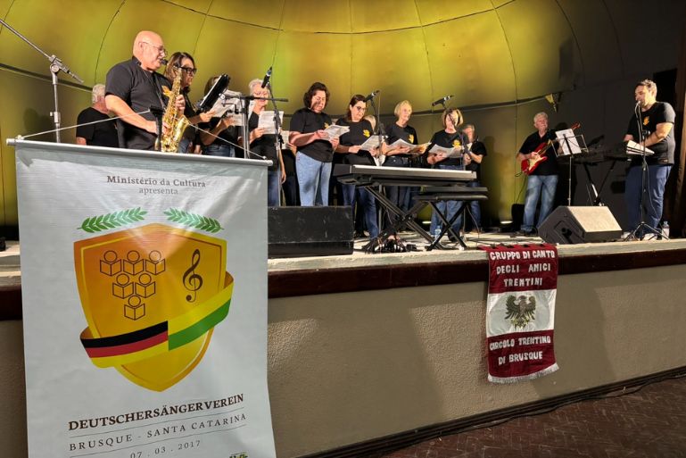 O som das vozes em harmonia marcou a noite de terça-feira, 11 de novembro, no 1º Encontro de Corais do Clube de Caça e Tiro Araújo Brusque. O evento reuniu três grupos tradicionais – Deutscher Sängerverein, Gruppo di Canto Degli Amici Trentini e Coro Unifebe – em uma celebração à diversidade cultural da cidade. Cada coral apresentou quatro músicas, com repertórios que passearam entre canções alemãs, italianas, brasileiras e natalinas, encantando o público presente.