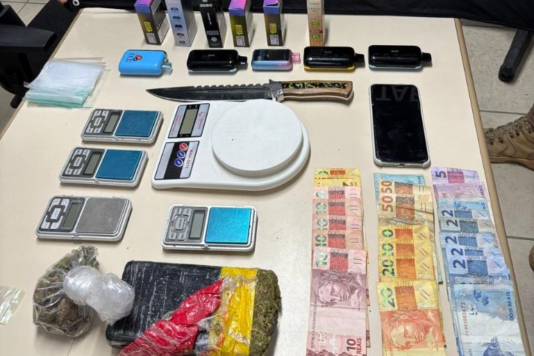 Foram apreendidos aproximadamente 489 gramas de maconha, além de embalagens individuais, balança de precisão, faca utilizada para fracionamento, 11 cigarros eletrônicos, R$ 448,00 em espécie e um aparelho celular.
