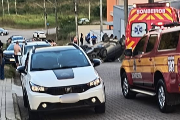 Um veículo capotou na tarde deste sábado (14) na rua Florência, no bairro Limeira, em Brusque. O acidente ocorreu por volta das 17h40 e mobilizou equipes do Corpo de Bombeiros.