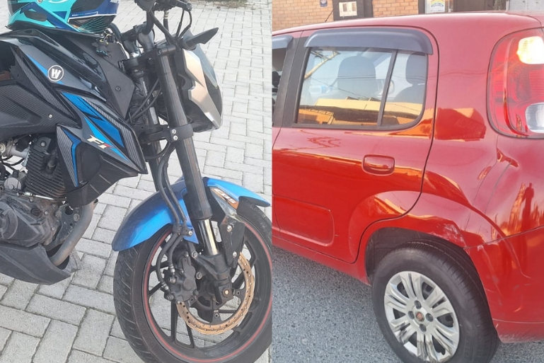 A motocicleta, que vinha logo atrás, não conseguiu parar a tempo e acabou colidindo na parte traseira do veículo.