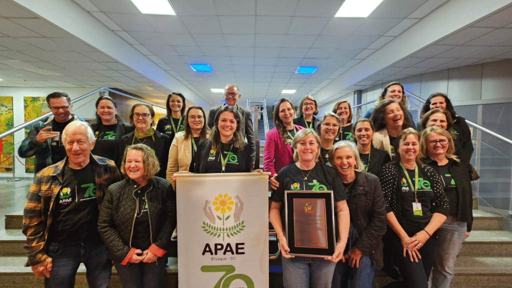 A Associação de Pais e Amigos dos Excepcionais (Apae) de Brusque foi homenageada na última segunda-feira, 24 de novembro, na Assembleia Legislativa de Santa Catarina (Alesc), em Florianópolis. Na ocasião, a entidade brusquense foi reconhecida pelo seu pioneirismo e pelos 70 anos de dedicação, acolhimento e serviços às pessoas com deficiência, bem como por promover a transformação social do Estado. A Sessão Especial da Alesc foi em comemoração dos 20 anos da Lei estadual nº 13.633/2005, popularmente conhecida como “Lei das APAEs”, que garantiu repasses mensais do Fundo Social às Associações de Pais e Amigos dos Excepcionais (Apaes) do Estado.