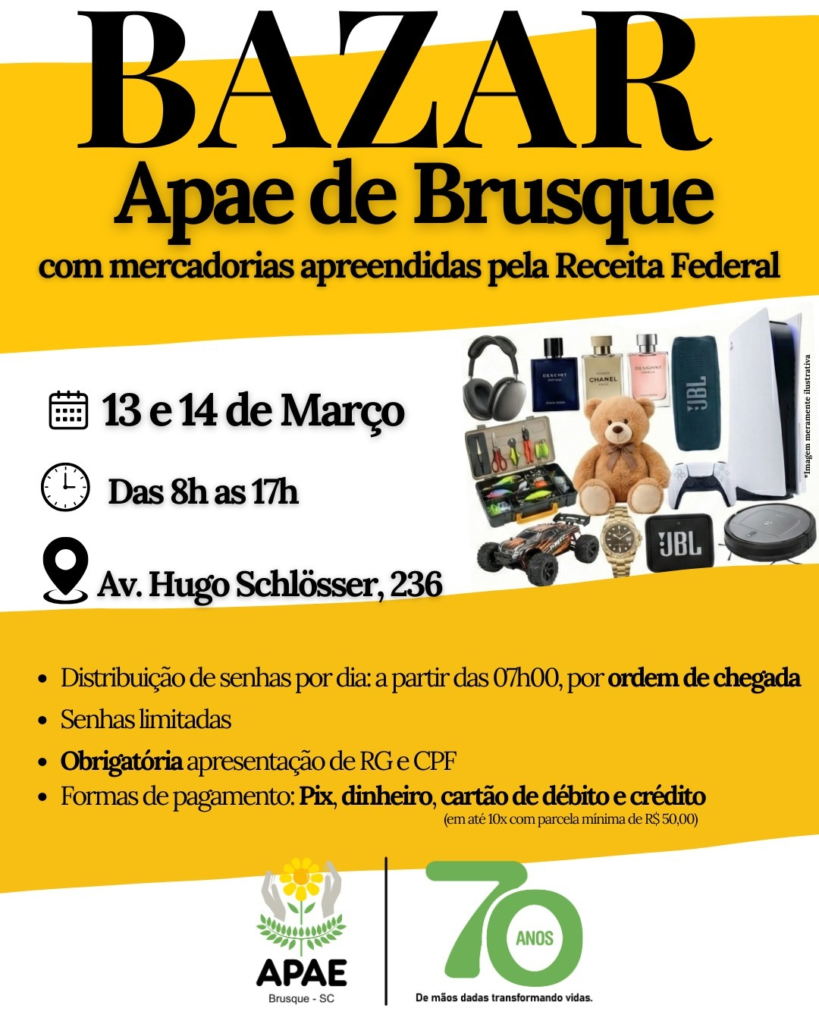 A Associação de Pais e Amigos dos Excepcionais de Brusque promove, nos dias 13 e 14 de março, um bazar com mercadorias apreendidas pela Receita Federal.