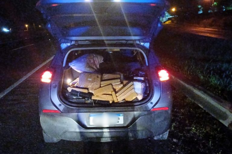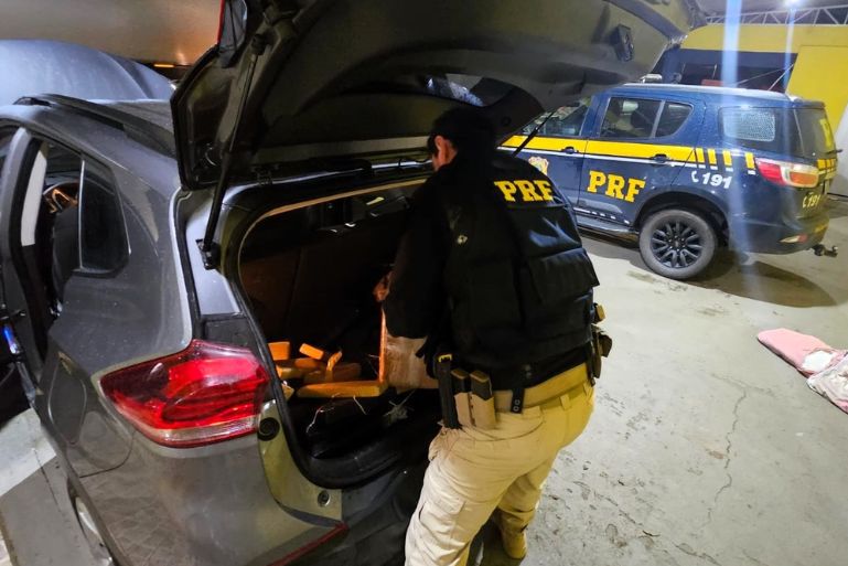 O veículo seguia sentido sul da rodovia quando recebeu ordem de parada. No entanto, o condutor desobedeceu e acelerou, realizando uma manobra de retorno e seguindo em alta velocidade no sentido norte. Depois de cinco quilômetros de perseguição, o veículo foi abordado pelos policiais. Durante a inspeção no interior do utilitário, os agentes encontraram os tabletes da droga no porta-malas e banco traseiro.