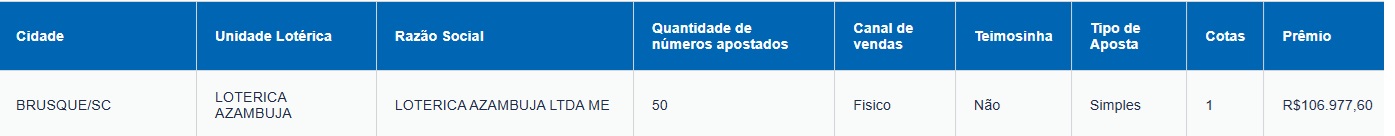 Uma aposta registrada em Brusque está entre as vencedoras do concurso 2897 da Lotomania, sorteado nesta segunda-feira (9). O jogo feito na Lotérica Azambuja acertou 19 números e garantiu um prêmio de R$ 106.977,60.