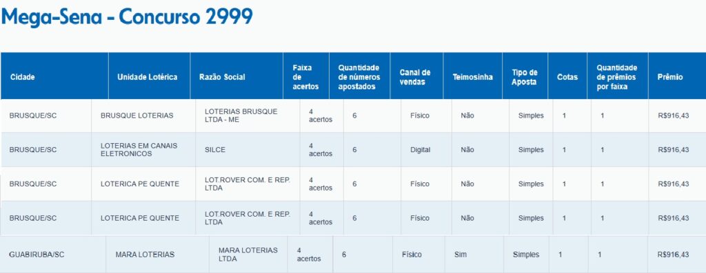 De Brusque, quatro apostas acertaram quatro dezenas. Uma delas foi realizada de forma online, duas na Lotérica Pé Quente e uma na Brusque Loterias. Em Guabiruba, uma aposta realizada na Mara Loterias também acertou quatro dezenas. Cada um dos ganhadores faturou o valor de R$ 916,43.
