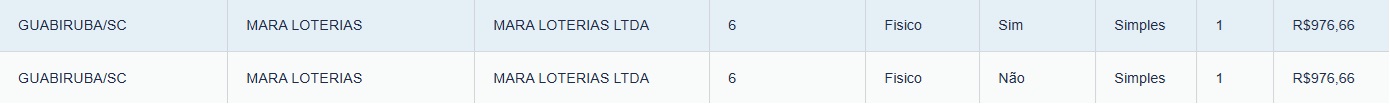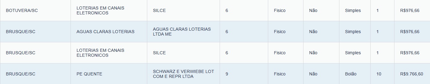 De Brusque, três apostas acertaram a quadra. As apostas foram realizadas nas Lotéricas Pé Quente (bolão com dez cotas) e Águas Claras. A terceira foi online.