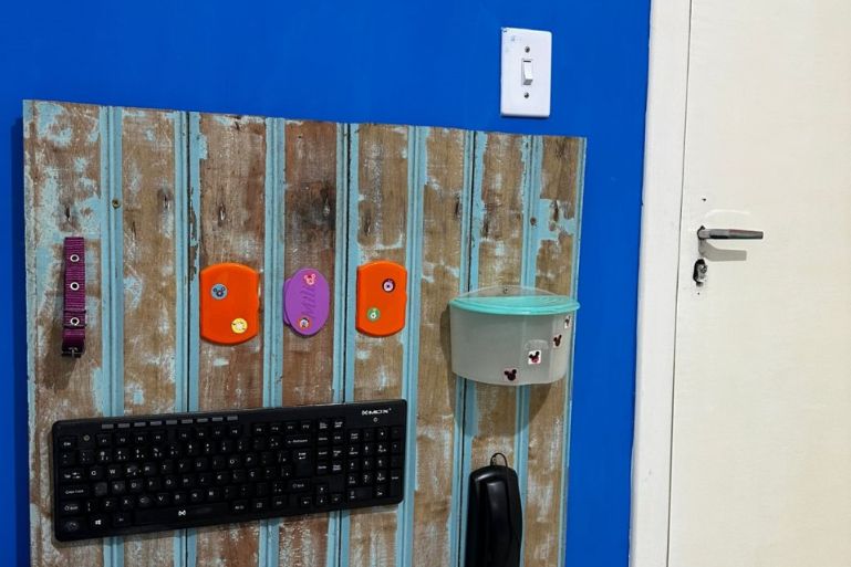 A partir de uma visita ao local, o grupo definiu o propósito artístico da intervenção. “Quando conhecemos a sala, percebemos que queríamos transformar o ambiente em algo mais acolhedor, especialmente para as crianças que passam por ali”, explica. Por isso, além da pintura com cores suaves e elementos que remetem à natureza e ao bem-estar, as alunas desenvolveram também um painel sensorial com teclado, interruptores de luz e outros itens interativos. A estrutura contou com apoio do pai de uma das participantes.
