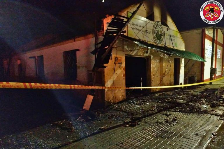 As guarnições constataram, ao chegar ao local, que a edificação comercial — com cerca de 200 metros quadrados — já estava em fase de desenvolvimento completo, com colapso total do telhado e ruptura das portas de vidro frontal.