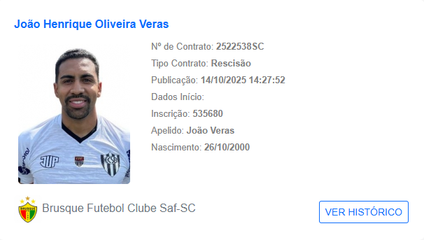 A rescisão de contrato com João Veras foi publicada no BID da CBF na terça-feira (14). O jogador estava afastado por indisciplina e não vinha sendo utilizado pelo técnico Bernardo Franco nas últimas partidas.