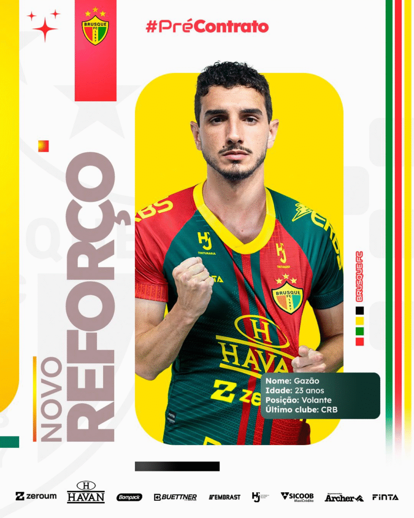 O Brusque Futebol Clube SAF anunciou nesta quarta-feira (3) a assinatura de um pré-contrato com o volante Gazão. O jogador chega para reforçar o elenco quadricolor nas disputas do Campeonato Catarinense e do Campeonato Brasileiro da Série C em 2026.