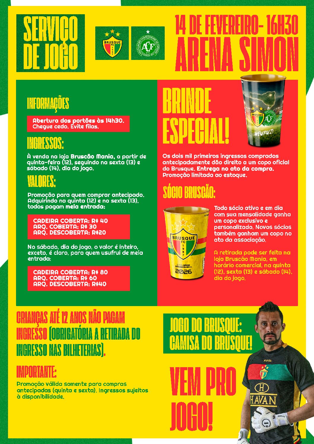 - Os dois mil primeiros ingressos comprados antecipadamente dão direito a um copo oficial do Brusque. Entrega no ato da compra. Promoção limitada ao estoque