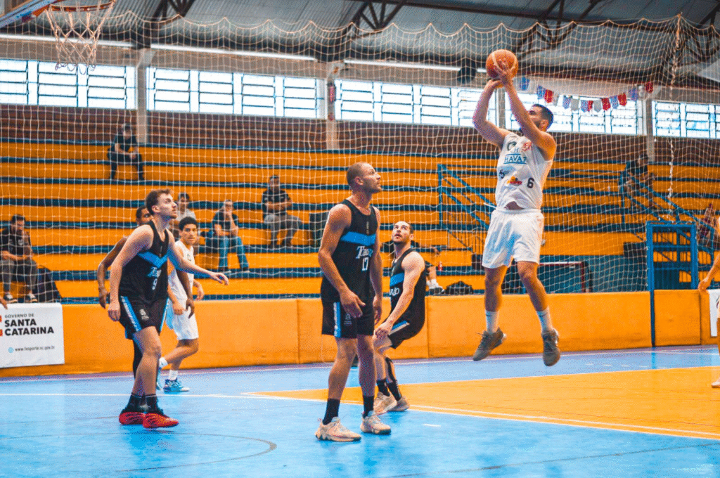A equipe de Brusque do basquete masculino entrou em quadra, na estreia da modalidade, vencendo com facilidade a equipe de Tubarão, com placar de 106 a 59. O time controlou o jogo de início ao fim, com destaque para o atleta Samuel (20), que acertou várias cestas de 3 pontos.