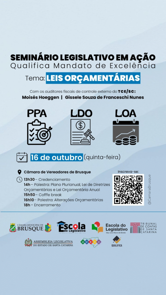 Plano Plurianual (PPA), Lei de Diretrizes Orçamentárias (LDO), Lei Orçamentária Anual (LOA) e as suas alterações são o tema do Seminário “Legislativo em Ação – Qualifica Mandato de Excelência”, que será promovido na Câmara Municipal de Brusque na tarde da próxima quinta-feira, 16 de outubro.