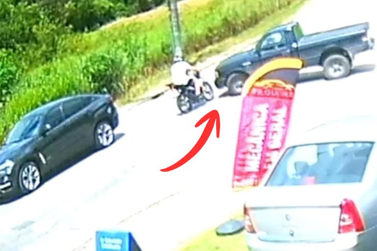 Nas imagens, é possível ver a caminhonete saindo de uma rua transversal quando o motociclista acaba colidindo na parte dianteira do veículo.