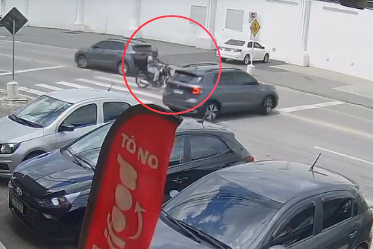 Quando o veículo já estava na pista, o motociclista colidiu na lateral do automóvel. O condutor da moto ainda tentou frear para evitar a batida, mas não conseguiu parar a tempo.