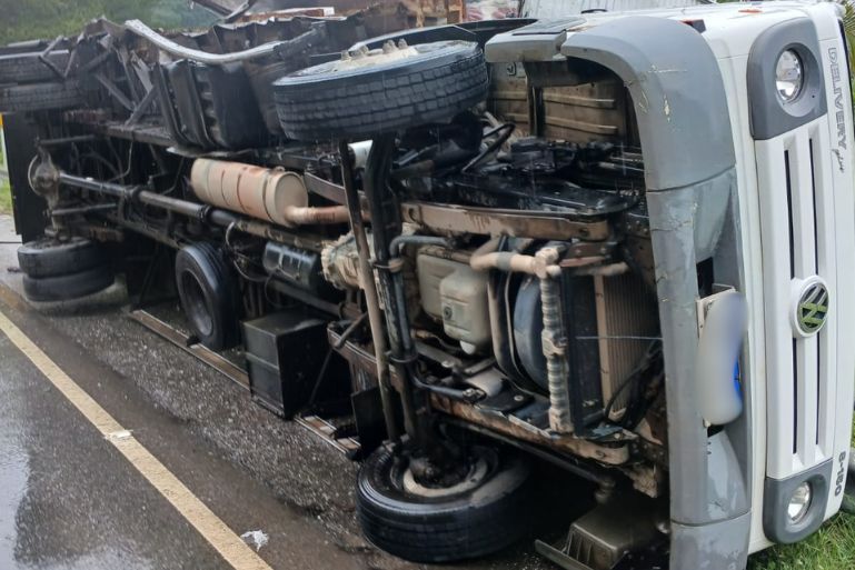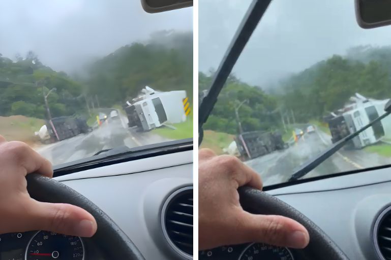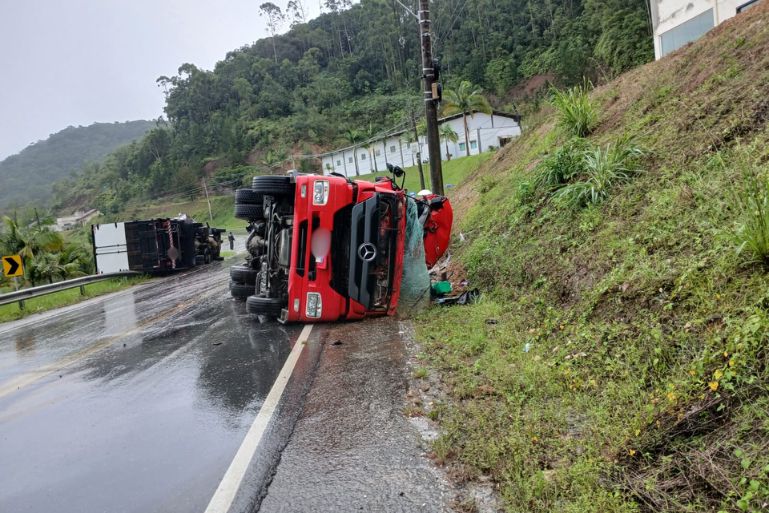 Com a força do impacto, os caminhões tombaram em sentidos opostos na via.
