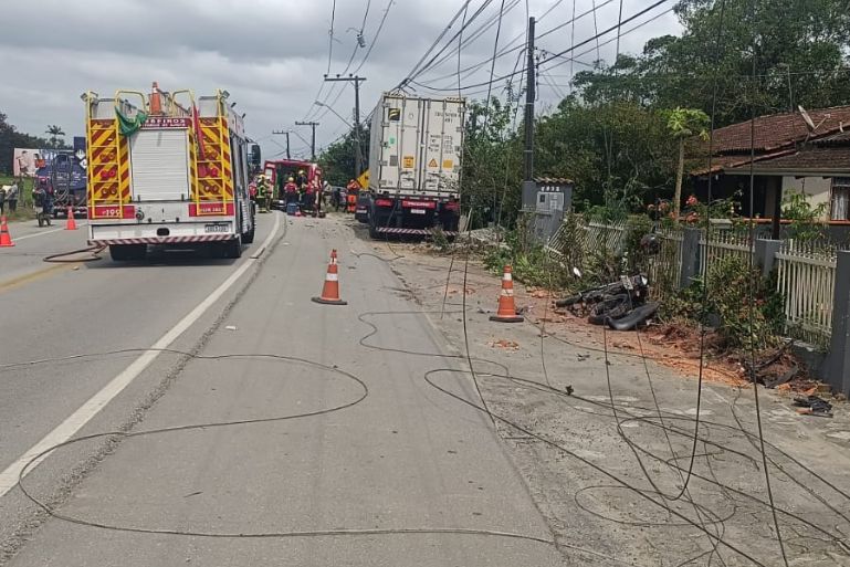 Um grave acidente mobilizou equipes de emergência na manhã desta quinta-feira (16/10), na Rodovia Jorge Lacerda, em Ilhota (SC). A ocorrência envolveu um caminhão que atingiu uma moto estacionada às margens da rodovia e colidiu contra postes de energia elétrica, na altura do quilômetro 8 da rodovia.