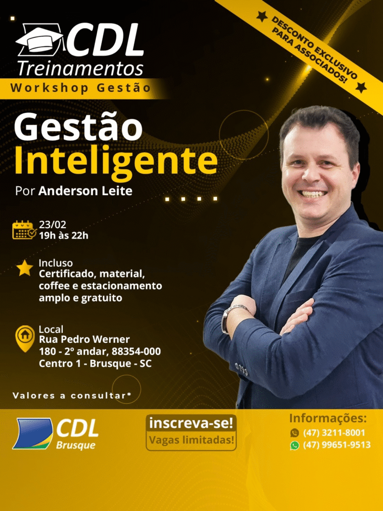 A Câmara de Dirigentes Lojistas de Brusque (CDL Brusque) inicia, em fevereiro, a programação de workshops da CDL Treinamentos em 2026. A primeira formação do ano será o curso Gestão Inteligente, marcado para o dia 23 de fevereiro.