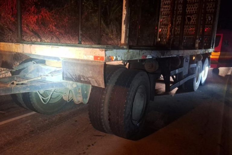 O caminhão apresentou danos na lateral esquerda. O reboque teve danos na roda e suspensão dianteira esquerda. Já o automóvel registrou danos no para-choque dianteiro, lateral esquerda, motor e roda/suspensão dianteira esquerda.