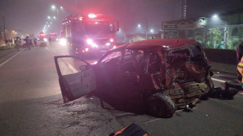 Um acidente envolvendo dois carros e uma motocicleta deixou quatro pessoas feridas na madrugada deste domingo (5), na BR-101, bairro Tabuleiro, em Barra Velha, no Litoral Norte de Santa Catarina. Todas as vítimas estavam conscientes no momento do atendimento, segundo informações do Corpo de Bombeiros Militar. Ocorrência foi registrada por volta das 2h39min.