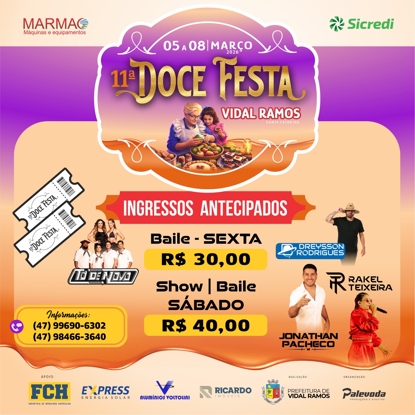 A Prefeitura de Vidal Ramos realiza, entre os dias 5 e 8 de março, a 11ª edição da Doce Festa, no Parque de Exposições do município. O evento reúne atrações culturais, musicais, gastronômicas, esportivas e atividades voltadas para toda a família.