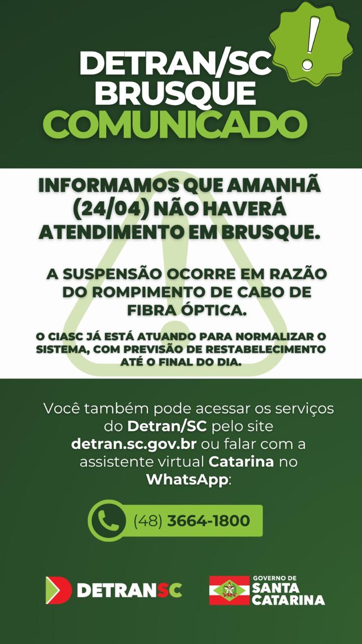 O atendimento do Detran/SC em Brusque está suspenso nesta sexta-feira (24/4). A interrupção dos serviços ocorre devido ao rompimento de um cabo de fibra óptica, que afetou o funcionamento dos sistemas da unidade.