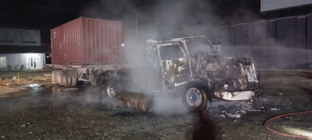 No local, os bombeiros encontraram o veículo com chamas concentradas na cabine, enquanto a carroceria, que transportava um container, apresentava sinais de aquecimento, embora ainda preservada.
