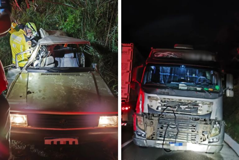 A ocorrência foi registrada por volta das 18h30 e envolveu a colisão entre um VW Gol e um caminhão Volvo FH. No carro estavam três ocupantes.