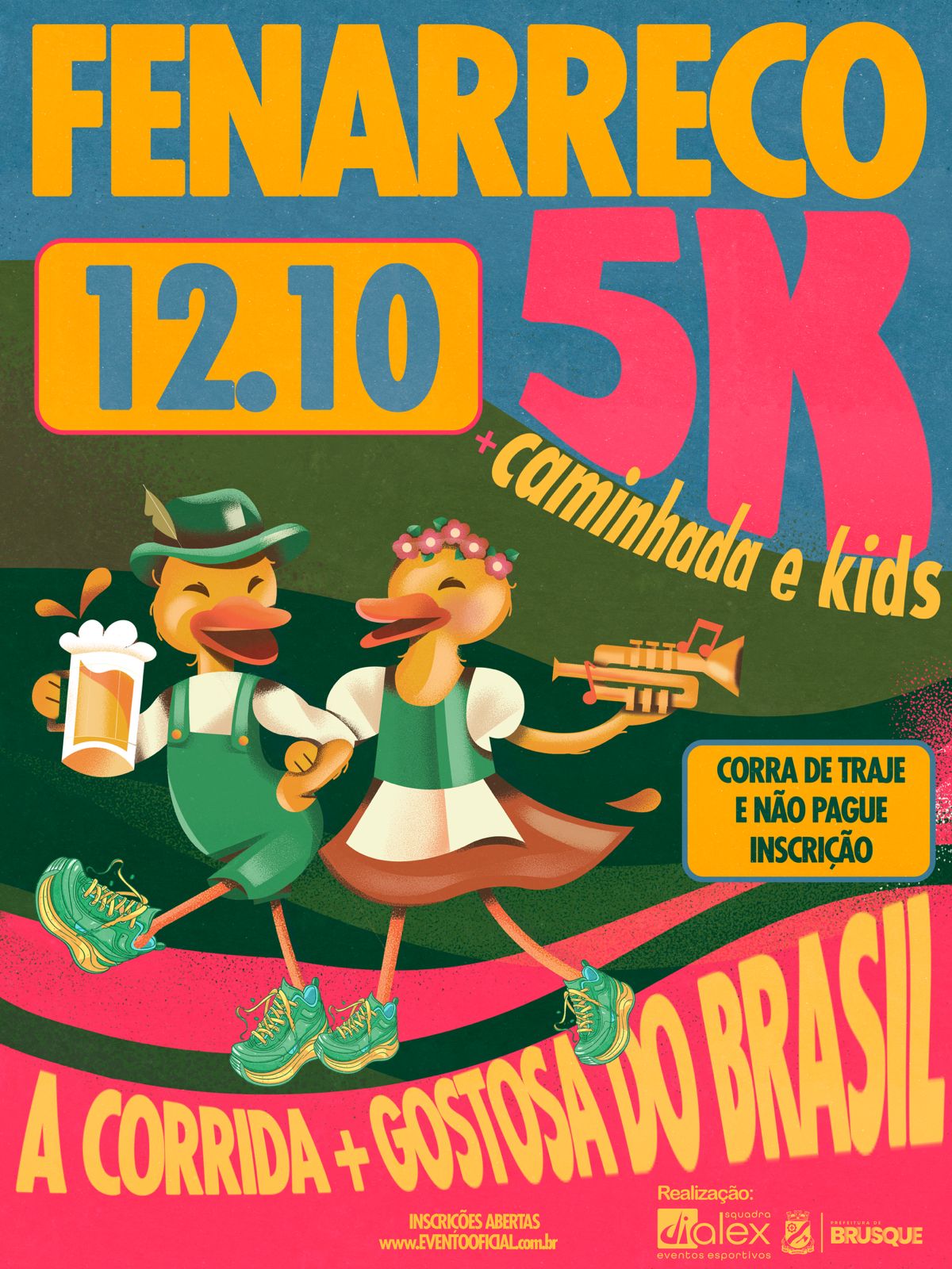 A Corrida Fenarreco, novidade da 38ª edição da festa, já está com inscrições abertas. A prova será realizada no dia 12 de outubro, com largada às 7h, em frente à Arena Brusque, e conta com percursos de 5 km, 3 km, caminhada, corrida kids e até uma prova especial para mascotes.