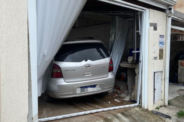 Ao chegar no local, os bombeiros encontraram uma colisão lateral envolvendo dois veículos. Com o impacto, um dos automóveis — um Nissan Livina — avançou sobre o pátio de uma residência, derrubando parte do muro e o portão da garagem.