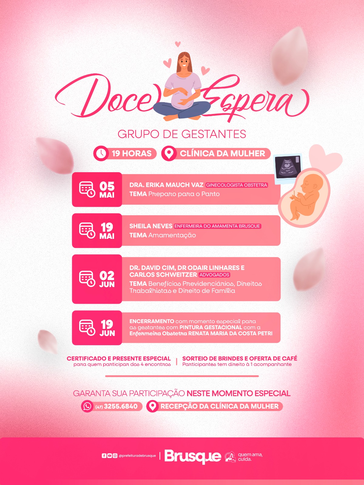 As interessadas podem se inscrever pelo WhatsApp da Clínica da Mulher, no número (47) 3255-6840, ou presencialmente na recepção da unidade. As vagas são limitadas. Todos os encontros contarão ainda com sorteio de brindes e café de confraternização.