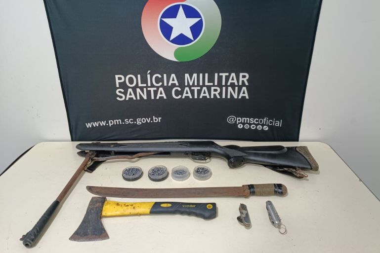 Durante as buscas no imóvel, os policiais apreenderam um facão, uma arma de pressão com munições, dois canivetes e uma machadinha.
