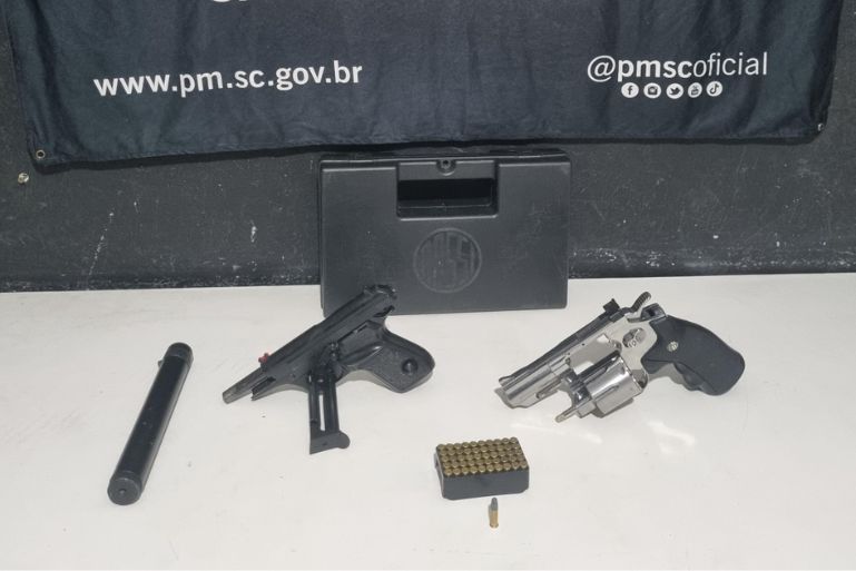 Além da arma, também foram apreendidas uma réplica de revólver inox e uma caixa com 45 munições calibre .22 intactas.