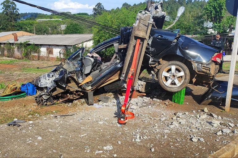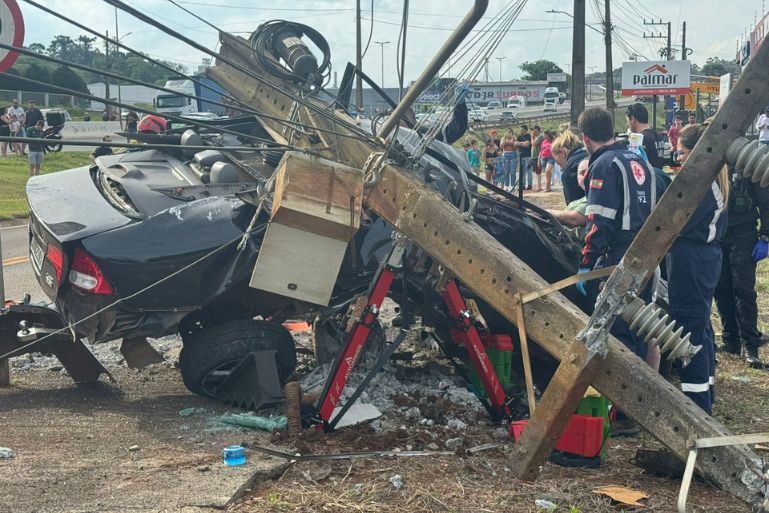 O impacto foi tão forte que o veículo ficou completamente destruído. O poste e a fiação elétrica caíram sobre o automóvel, exigindo atenção redobrada das equipes de resgate, que atuaram com segurança por conta da rede elétrica energizada.