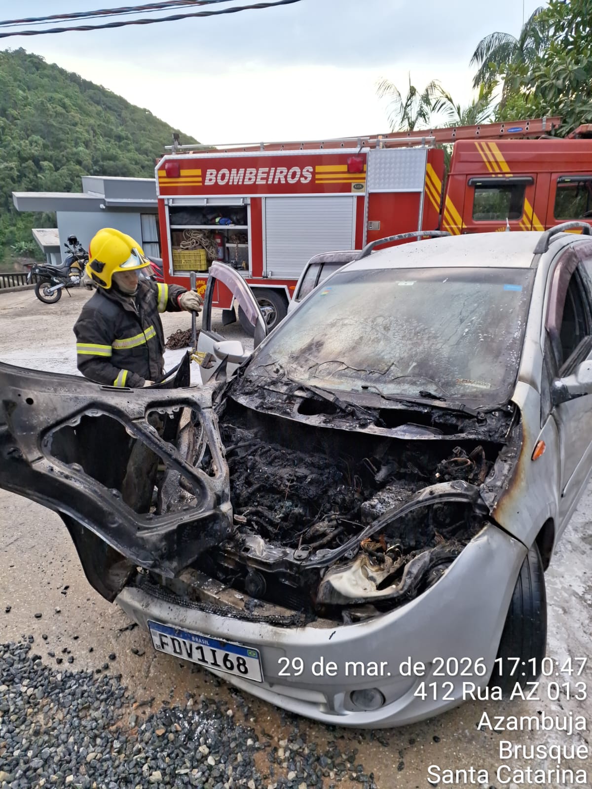 Quando a guarnição chegou ao local, o incêndio já estava extinto. Os bombeiros realizaram a abertura do capô e fizeram o rescaldo preventivo por aproximadamente 10 minutos, utilizando água fornecida por moradores de uma residência próxima.