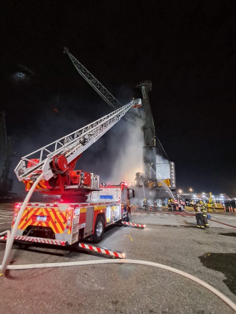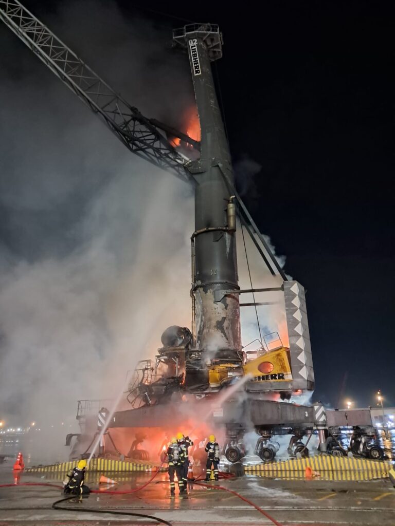 De acordo com informações da equipe portuária, o guindaste estava em manutenção no momento em que o incêndio começou.