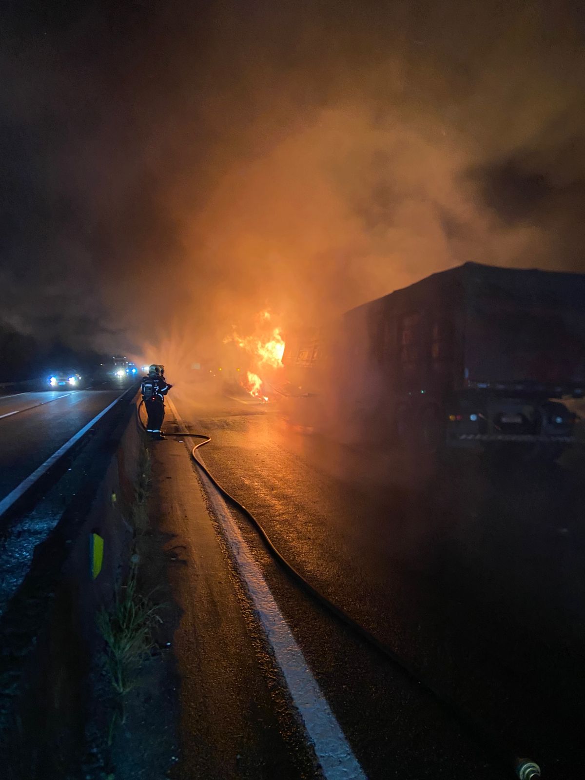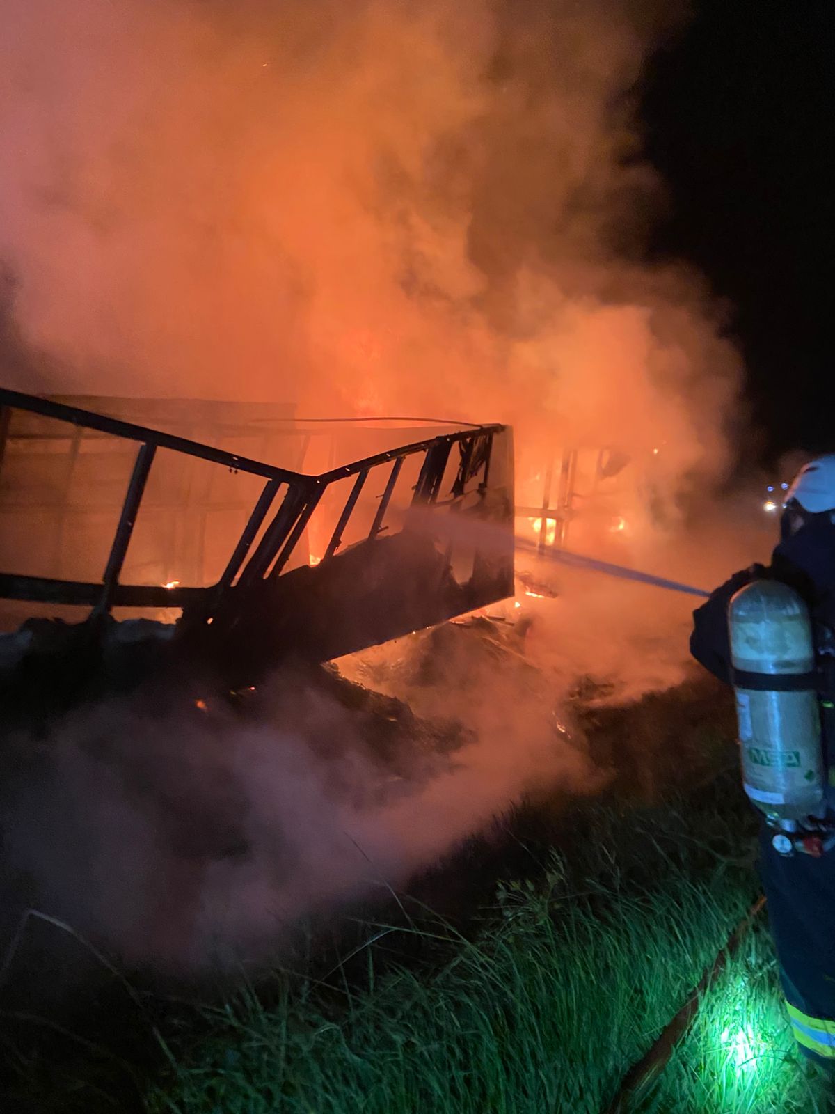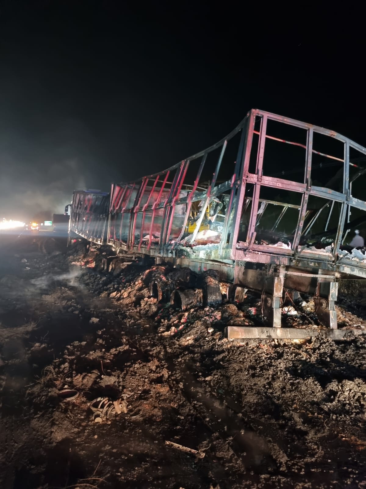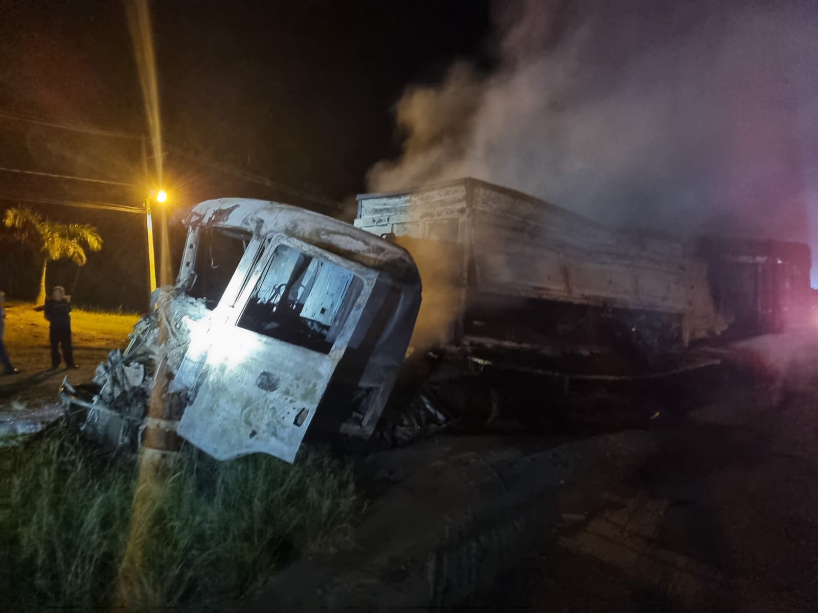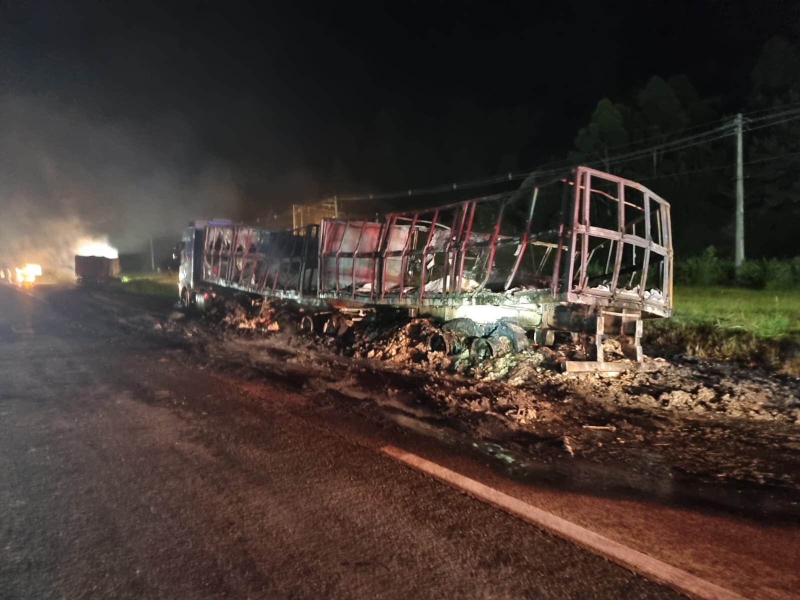 A carreta que estava atrás estava totalmente tomada pelas chamas, com incêndio no compartimento de carga e também no conjunto tanque de combustível. Já o veículo da frente teve o fogo concentrado apenas na carga, mantendo o cavalete preservado.
