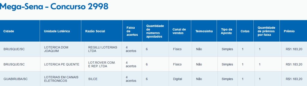 De Brusque, duas apostas acertaram quatro dezenas. De Guabiruba, uma aposta também acertou a quadra.