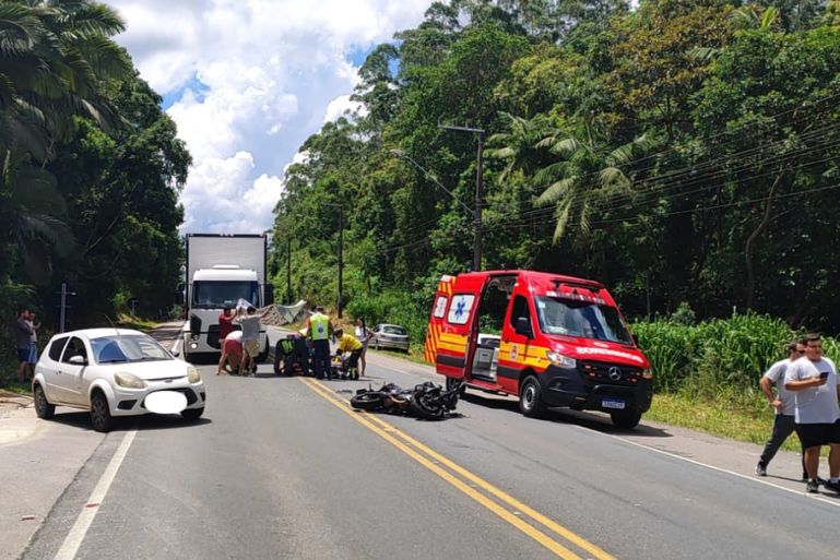 Um acidente de trânsito envolvendo um carro e uma motocicleta mobilizou equipes do Corpo de Bombeiros Militar de Gaspar no início da tarde desta segunda-feira (9), por volta das 12h58, na rodovia Ivo Silveira, bairro Volta Grande, em Brusque, nas proximidades do Catarina Shopping.