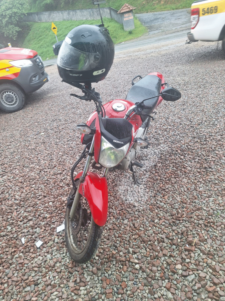A Polícia Militar Rodoviária lavrou o boletim de ocorrência e sinalizou o local. A motocicleta, que apresentava irregularidades, foi autuada e removida ao pátio conveniado, enquanto o veículo Voyage foi liberado.