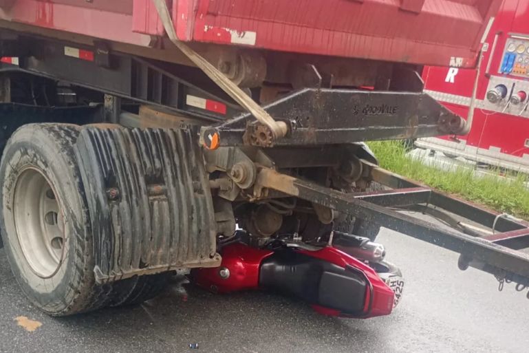 Durante a ação, a motocicleta acabou colidindo contra uma estrutura fixa da via. Com o impacto, a moto caiu e deslizou pela pista, parando sob o caminhão. O condutor sofreu ferimentos graves, incluindo fraturas e contusões de grande impacto.