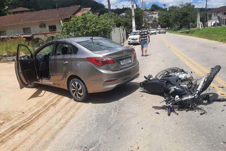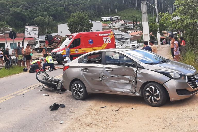 Na manhã deste domingo (25 de janeiro de 2026), um acidente de trânsito entre carro e motocicleta mobilizou equipes do Corpo de Bombeiros e do SAMU em Brusque, no bairro São Pedro.