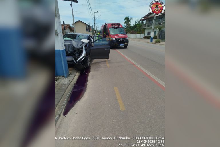 Uma colisão entre um automóvel e um poste foi registrada por volta das 12h33 desta sexta-feira (26) na rua Carlos Boss, no bairro Aymoré, em Guabiruba.