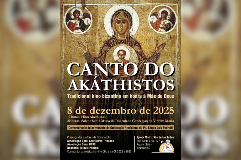 A Igreja Matriz da Paróquia São Judas Tadeu, no bairro Águas Claras, em Brusque, convida a comunidade brusquense e regional para a celebração dedicada à Imaculada Conceição da Virgem Maria, com destaque para a apresentação do antiquíssimo hino bizantino mariano Akáthistos. A palavra significa “de pé”, indicando a forma correta de cantar o hino. Ele tem origem no século V, sendo composto pouco depois do Concílio de Calcedônia (451), e é amplamente reverenciado na tradição bizantina.