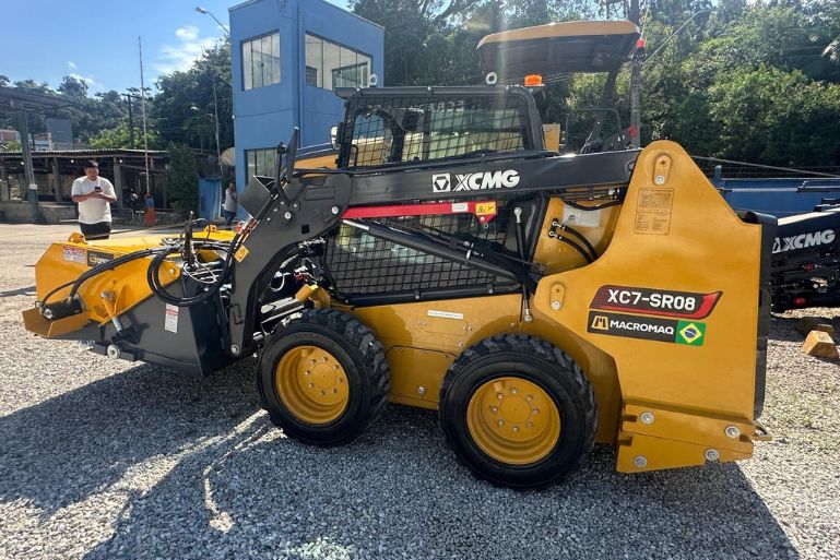 As mini carregadeiras possibilitam o uso de diferentes implementos, como vassoura mecanizada, capinadeira, roçadeira e concha, com troca prática por meio do sistema de engate rápido, de acordo com a necessidade do serviço.