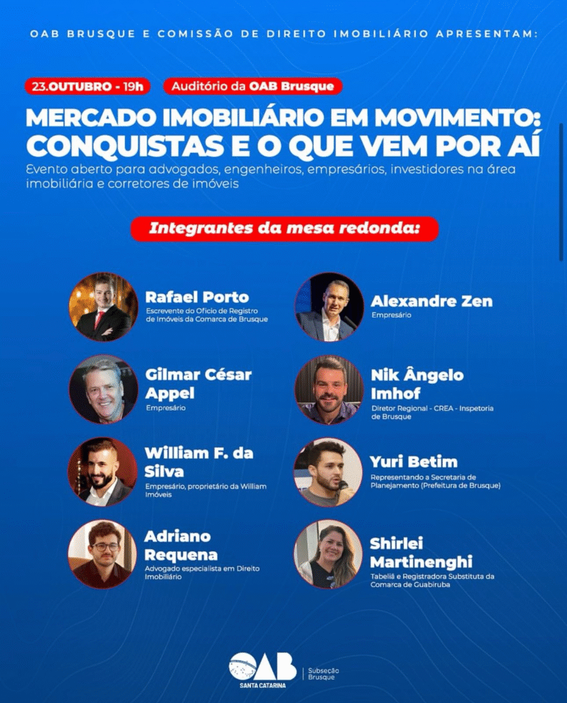 Voltado a advogados, engenheiros, corretores de imóveis, investidores e empresários, o evento tem como objetivo oferecer uma visão prática e estratégica sobre as mudanças que têm impactado o mercado imobiliário, especialmente no cenário de Brusque e região.