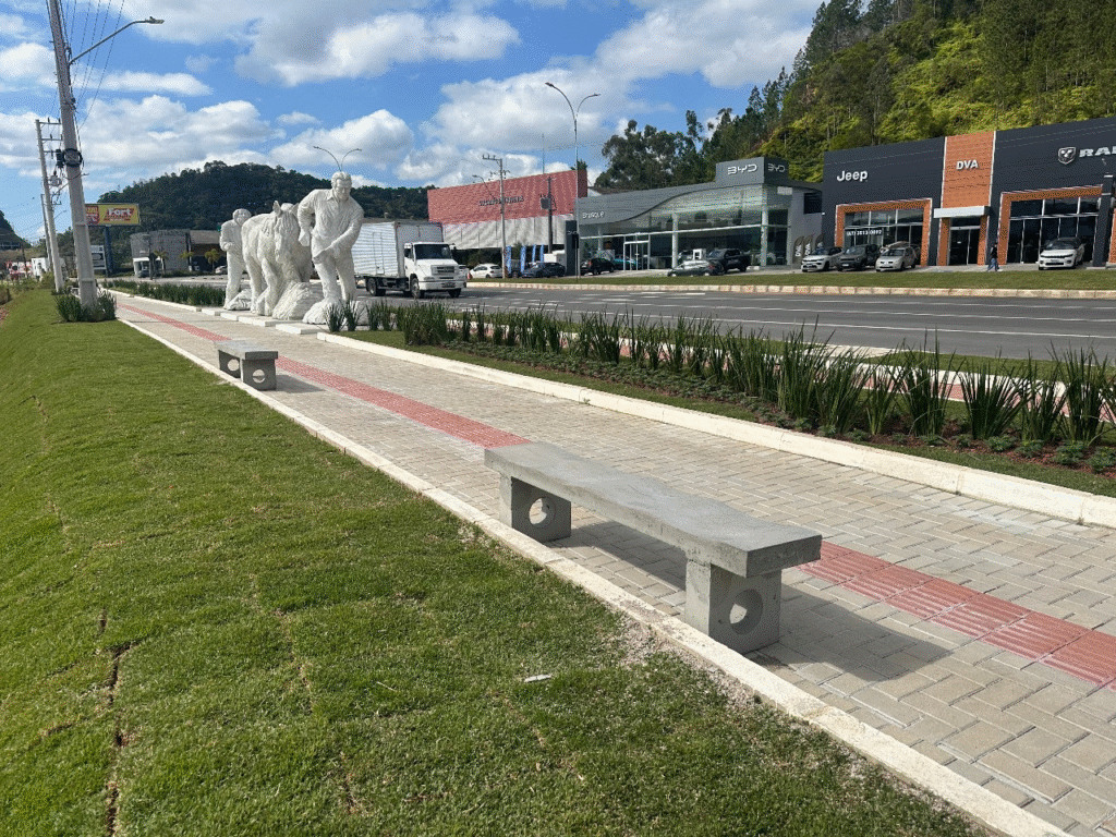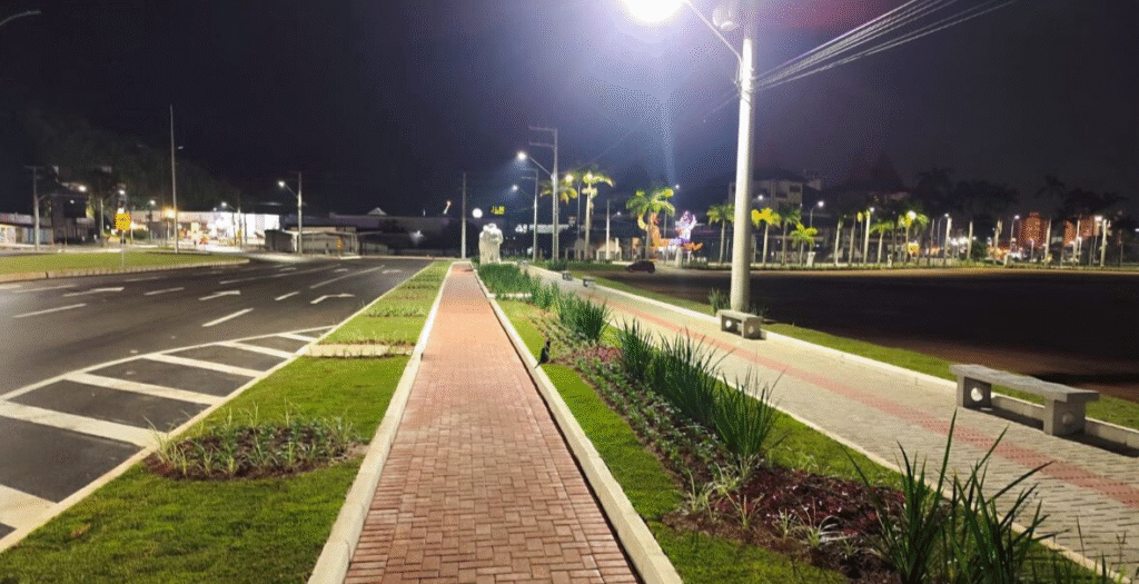 A “Gota de Acesso” também ganhou novo sistema de iluminação, com a instalação de cinco postes e 12 luminárias. A ação faz parte do projeto de revitalização da Rodovia Antônio Heil, promovendo mais segurança e valorização do espaço urbano. Os trabalhos foram realizados por uma equipe de quatro servidores, com um veículo, em dias alternados, totalizando uma semana, devido à simultaneidade das outras frentes de trabalho do local.