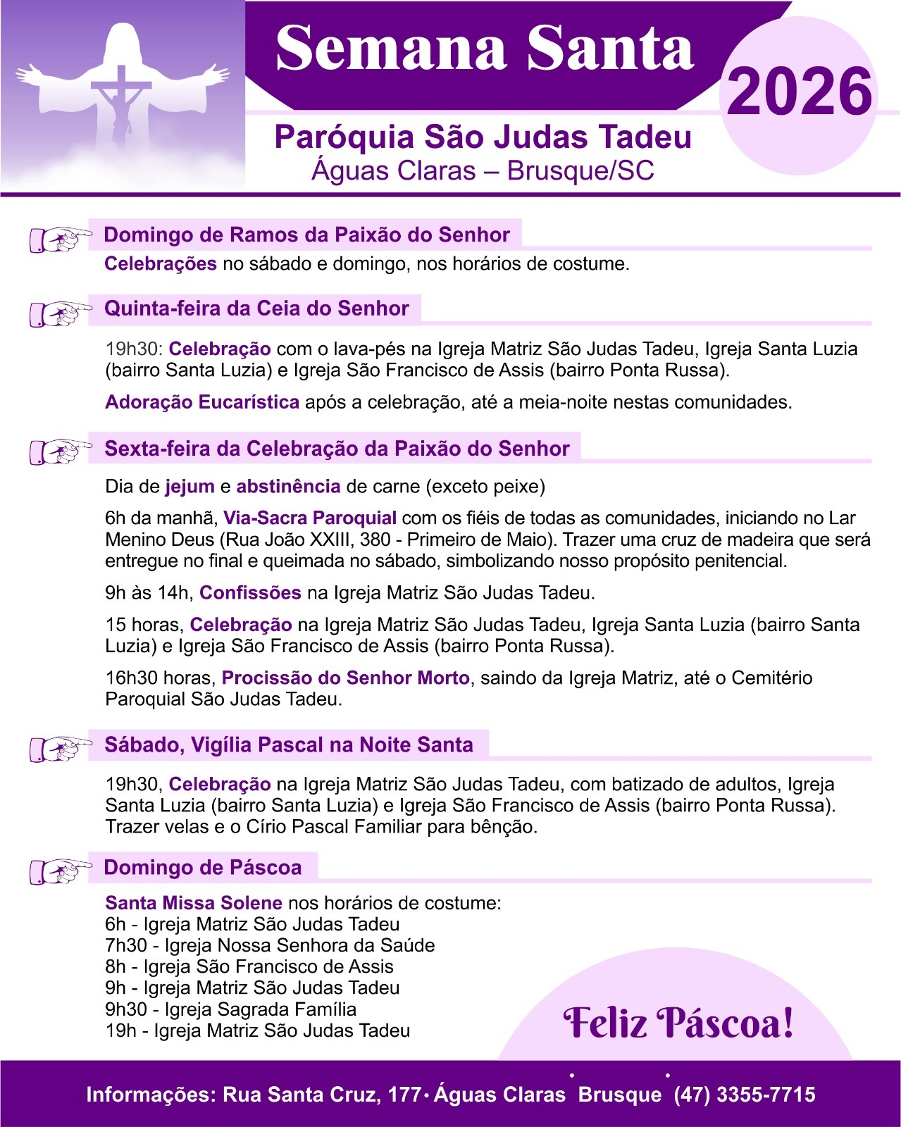 A Paróquia São Judas Tadeu, no bairro Águas Claras, em Brusque, divulgou a programação oficial da Semana Santa 2026, com celebrações que iniciam no Domingo de Ramos e seguem até o Domingo de Páscoa.