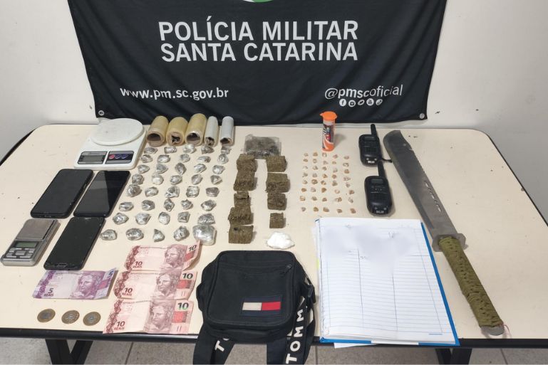 Na sequência, os militares realizaram buscas dentro da casa, onde encontraram uma quantidade significativa de entorpecentes e diversos materiais utilizados no preparo e na comercialização. Entre os itens apreendidos estavam porções de maconha, crack e cocaína, além de duas balanças de precisão, caderno com anotações do tráfico, rádios comunicadores, celulares e materiais de embalagem.