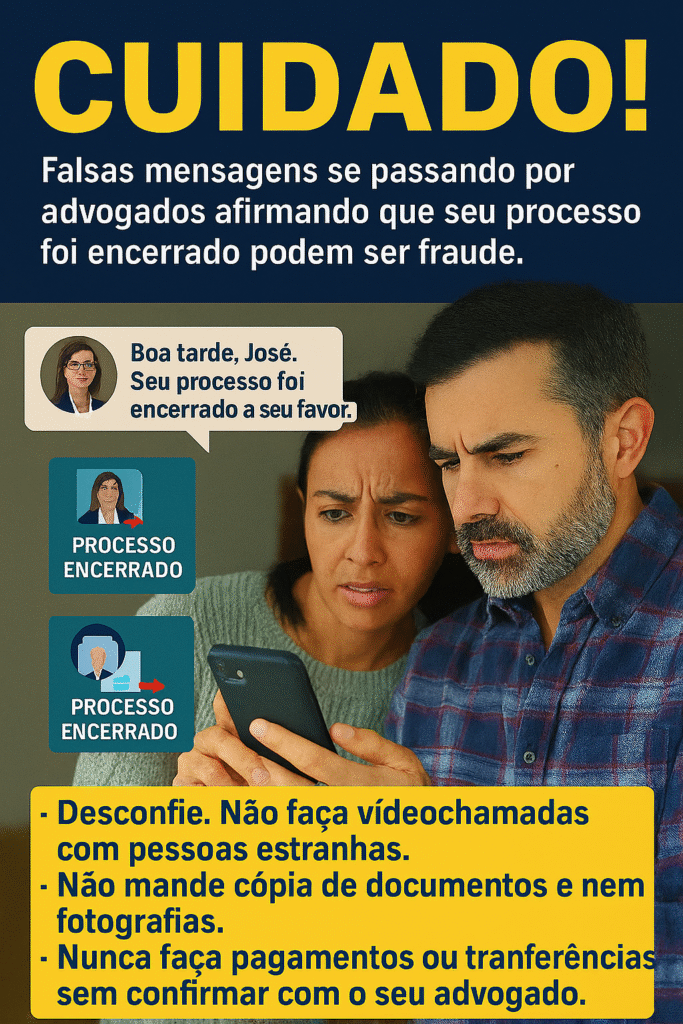 Também recomenda que qualquer promessa de valores ou processos seja confirmada diretamente com o advogado de confiança ou por canais oficiais da Justiça.